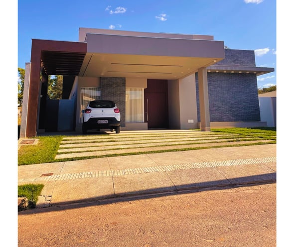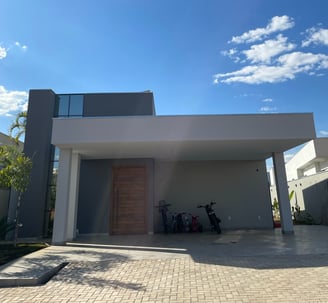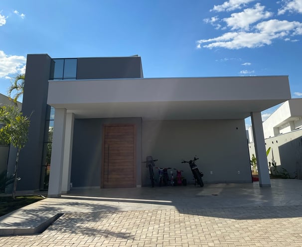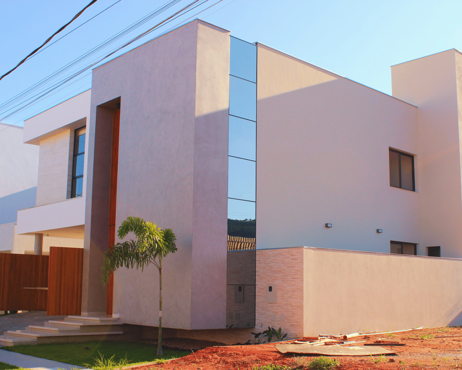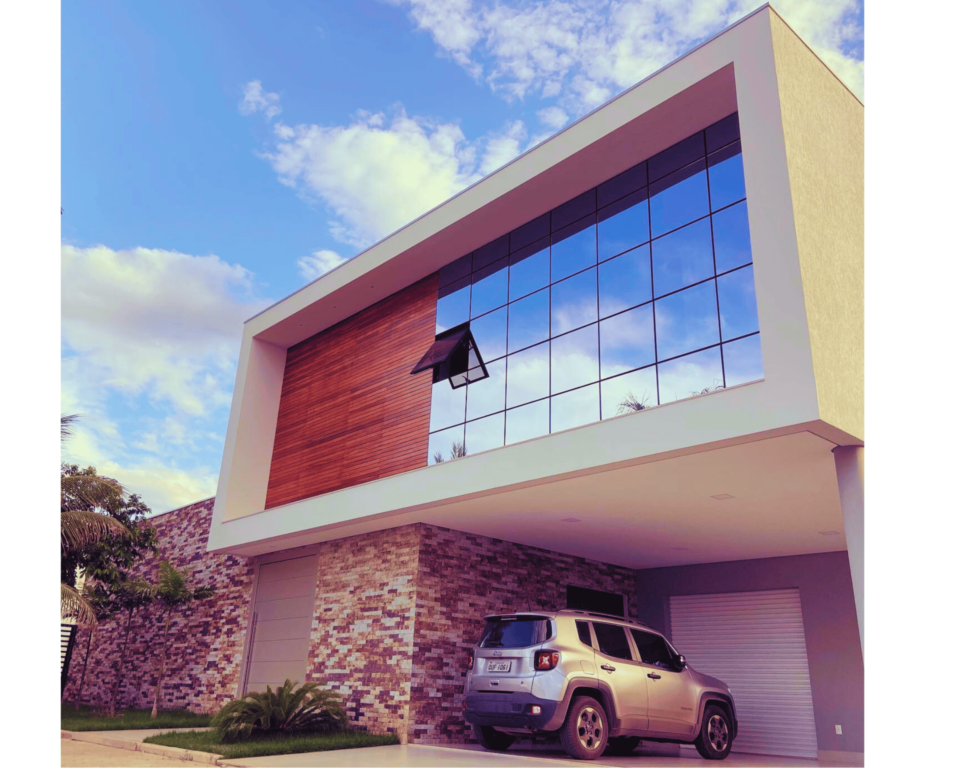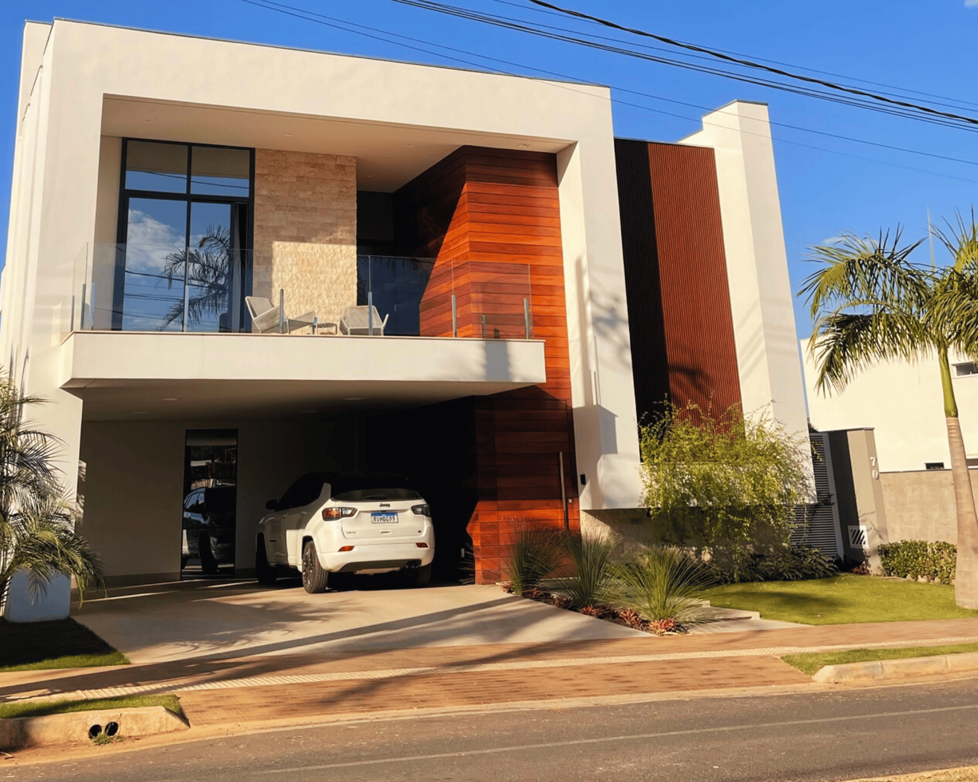 A fachada da casa conta com uma encantadora estrutura em balanço, que é de tirar o folego, com detalhes angulados feitos em concreto armado. Prezando sempre pela qualidade ao longo do tempo!